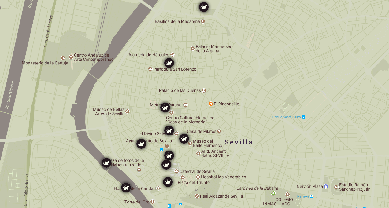 Como promoción y homenaje, por tanto, la ciudad se ha llenado de estas ratas doradas que se ubican en los lugares claves de la historia: la Cárcel Real, situada en la calle Sierpes; la calle Pureza; la Plaza de Molviedro; las gradas de la Catedral; la imprenta Cromberger, en la calle Pajaritos; la Casa de la Moneda; la Alameda de Hércules; el Hospital de las Cinco Llagas ; el Castillo de San Jorge; la Plaza del Cabildo; y la Casa Monardes, en calle Sierpes. Lugares marcados donde, además, se puede escanear un código QR con el móvil, llevando a una audioguía y una breve explicación sobre el porqué y la historia de cada uno de ellos.