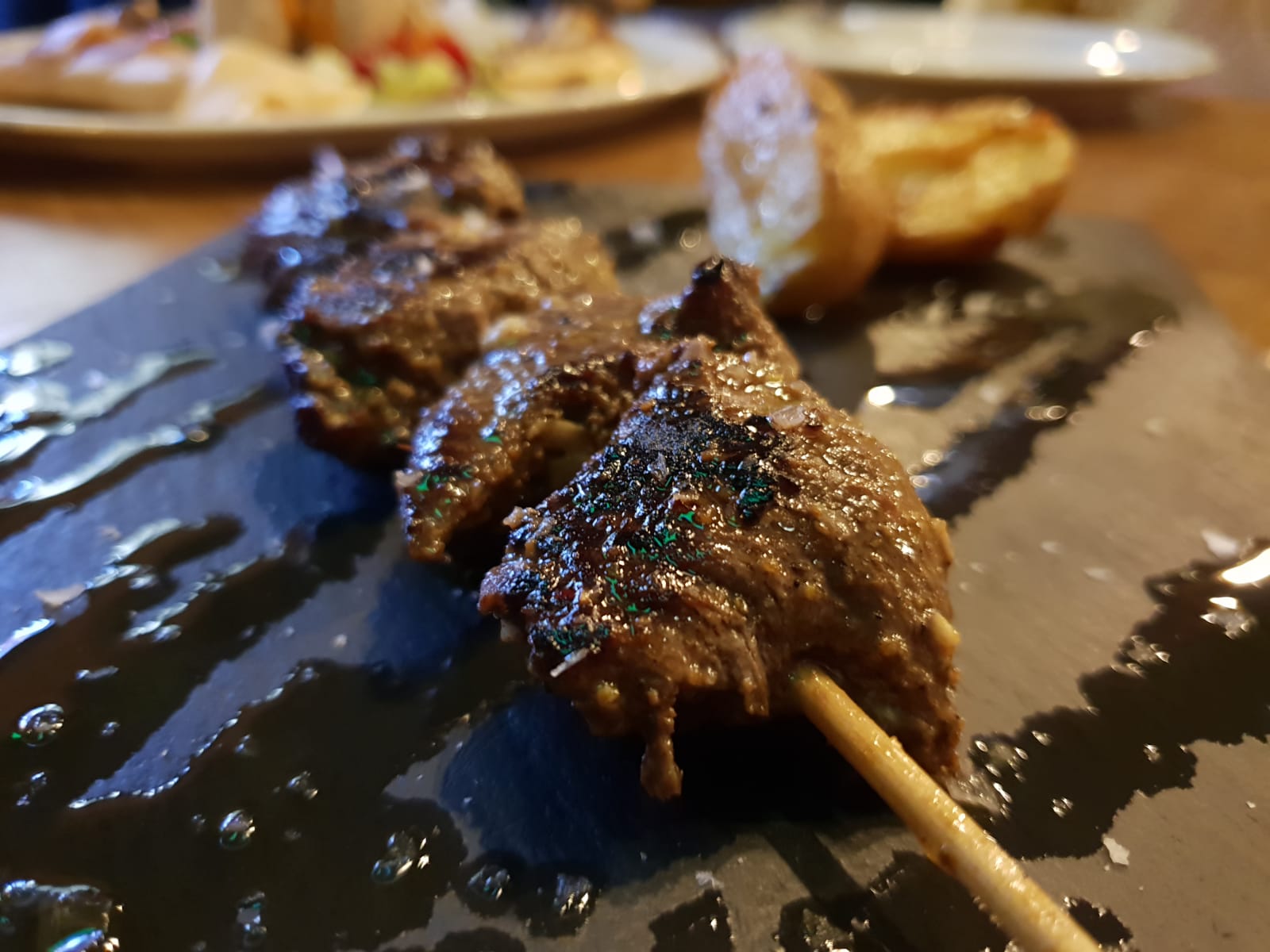 Esta vez nos saltamos la segunda tradición de probar la ensaladilla y lo hicimos en pos de las dos propuestas fuera de carta: el pulpo a la gallega con base de puré de patatas y el pincho de ternera. Ambas un acierto de nuevo, pero si hay que resaltar algo es el sabor espectacular del pincho y el punto increíble de la carne.